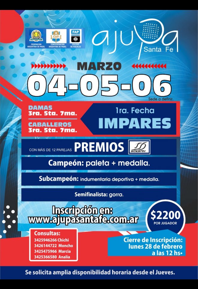 »» Evento: 1ER FECHA AJUPA 2022 »» Localidad: Santa Fe | Santo Tomé »» Fechas: 03/03/2022 al 13/03/2022